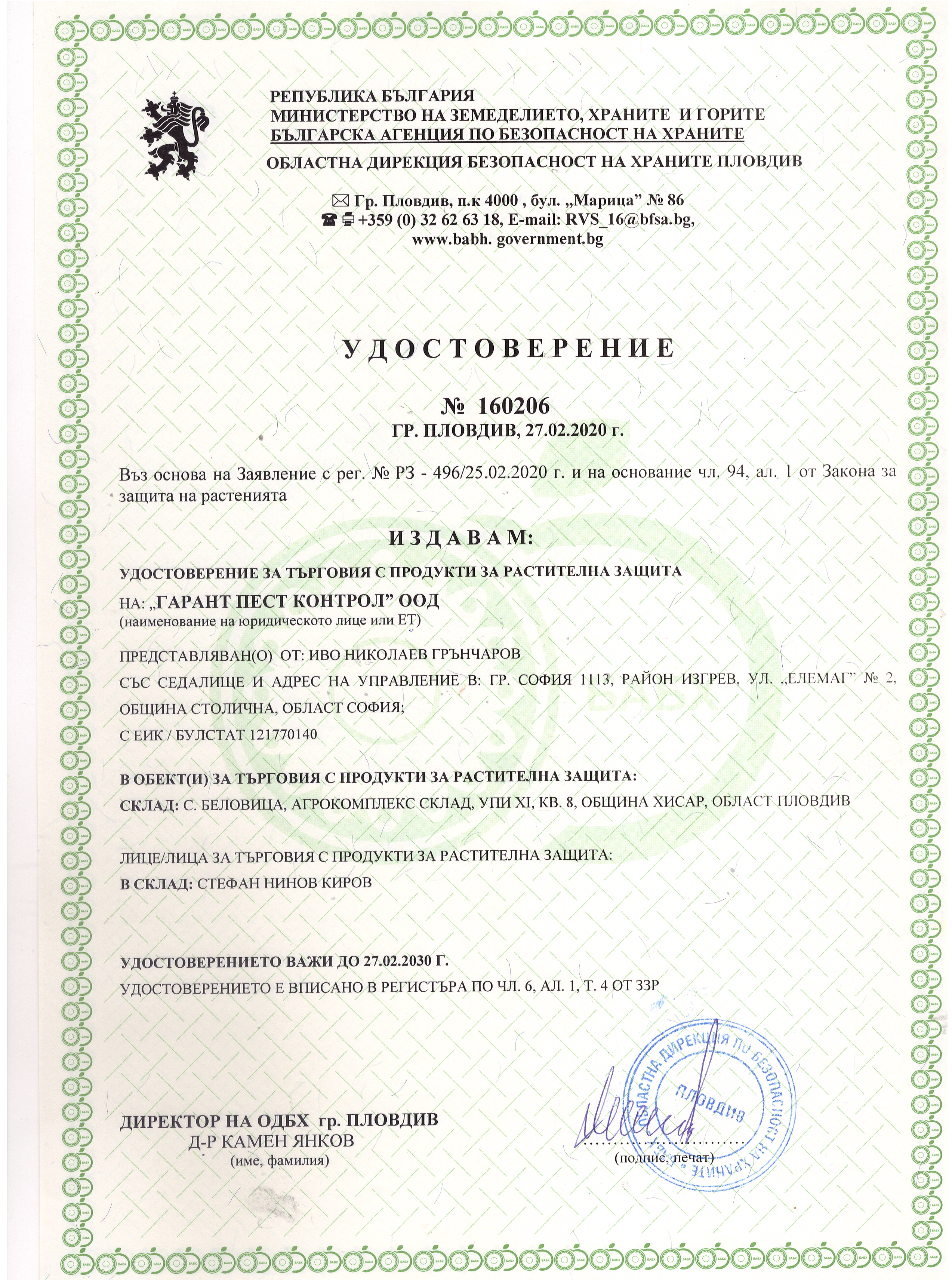 » Удостоверение за търговия с продукти за растителна защита