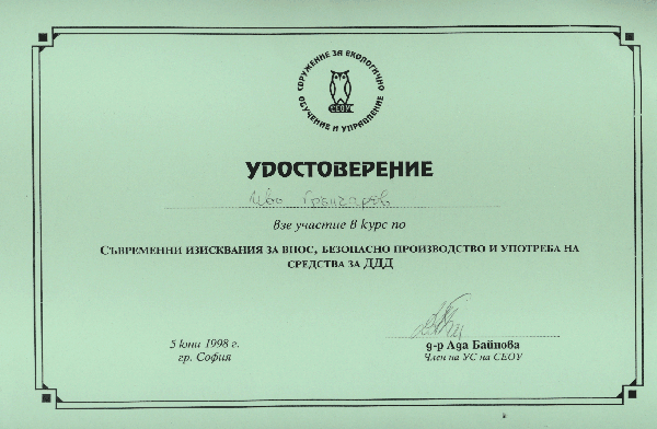 » Удостоверение за участие в курс за съвременни изисквания за внос…